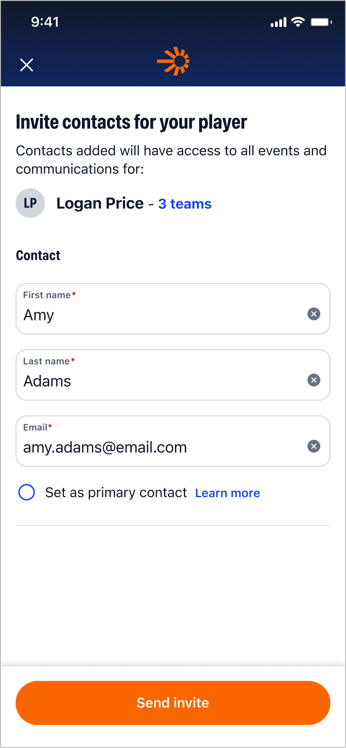 The new contact will receive an email invitation. If they already have a TeamSnap account, they'll be added automatically. Note that adding a contact gives them access to all teams your player is currently on.